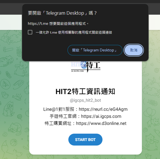 t.me/igcps_hit2_bot,點擊彈出的 Telegram Desktop。